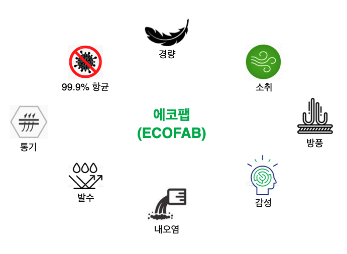 에코팹-C(ECOFAB-C)는 친환경 원단 [면(Cotton), 울(Wool), 레이온(Rayon), 리사이클(Recycle) 원단 등]에 다양한 기능을 적용 시킨 친환경 고분자 수성액을 코팅하여 스킨층을 형성해서 만든 친환경 기능성(내마모, 내광, 내열, 내오염, 항균, 감성터치 등) 원단입니다.